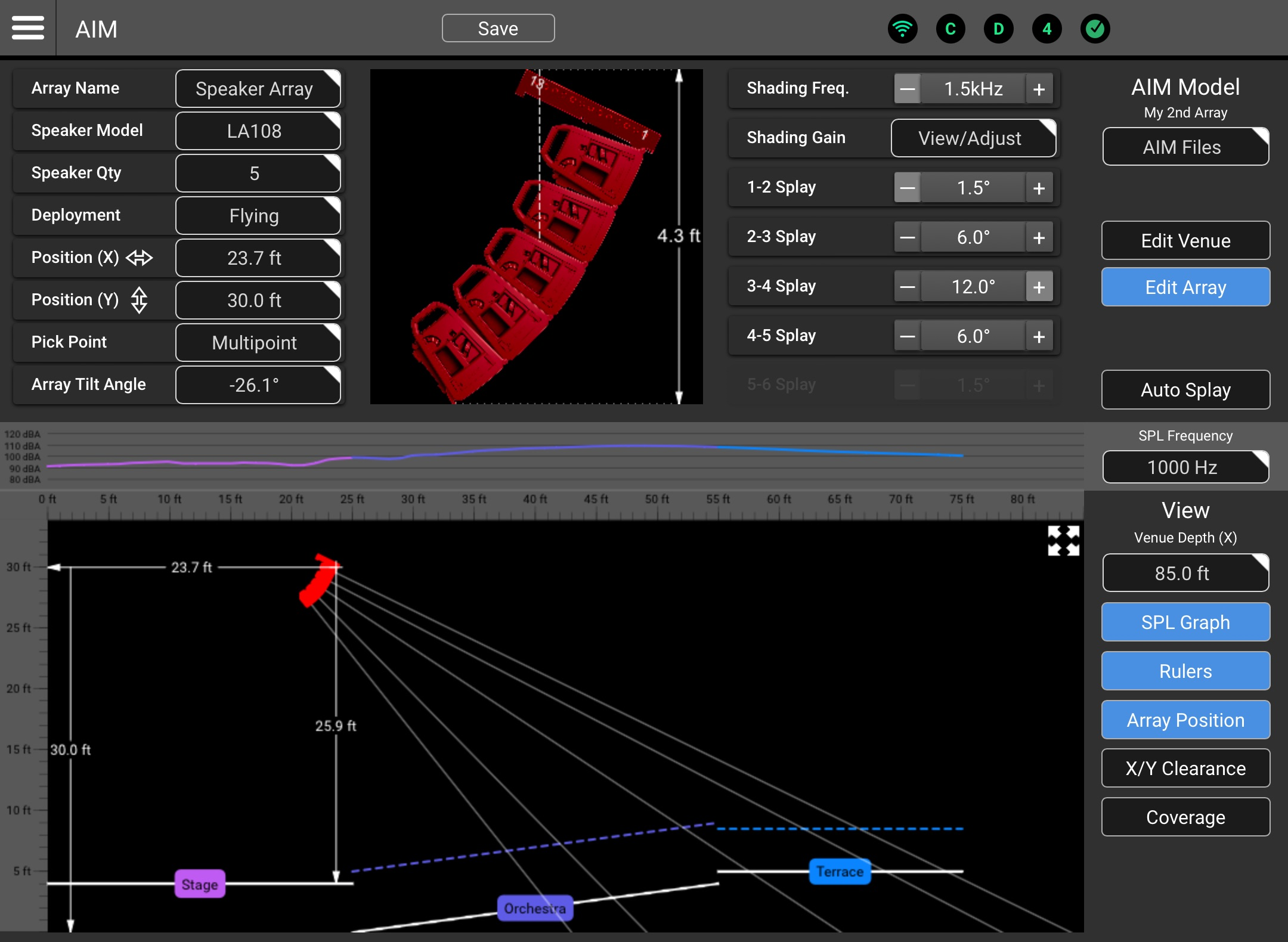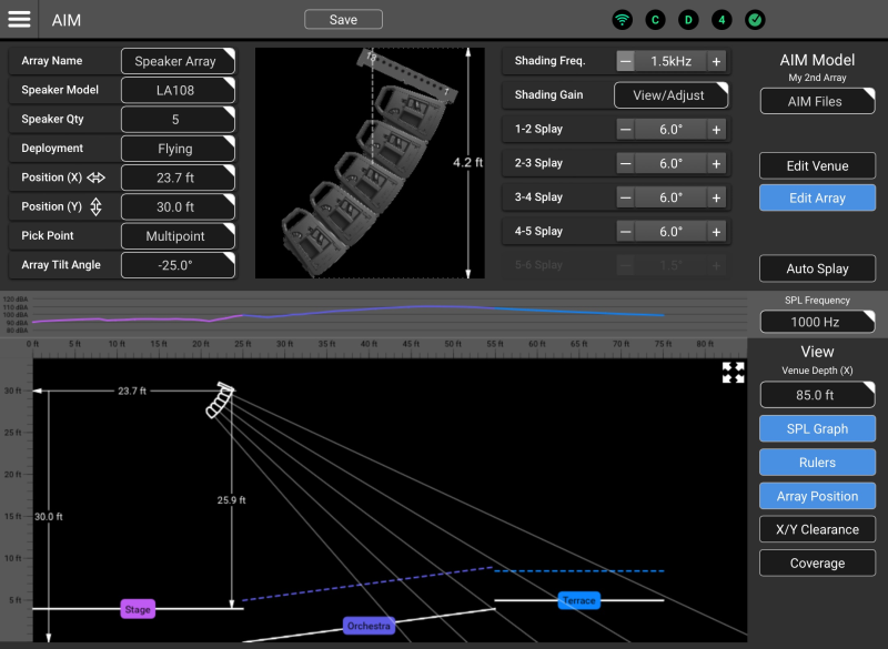 Array Installation Modeling (AIM) is a QSC System Navigator prediction tool used for visualization of array coverage in a scaled, graphical model of a venue or installation space. AIM also provides dimensional and weight data for an array as well as pick-point recommendations. is used to select an L Class loudspeaker model, specify the quantity of loudspeakers in the array and make deployment selections.