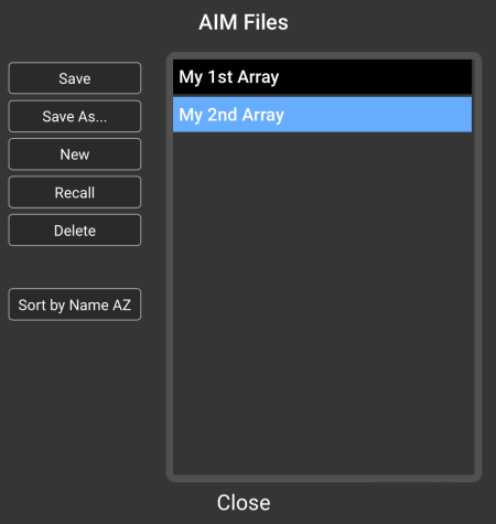 AIM Files may be stored, recalled and managed by touching or clicking the Aim Files button.
