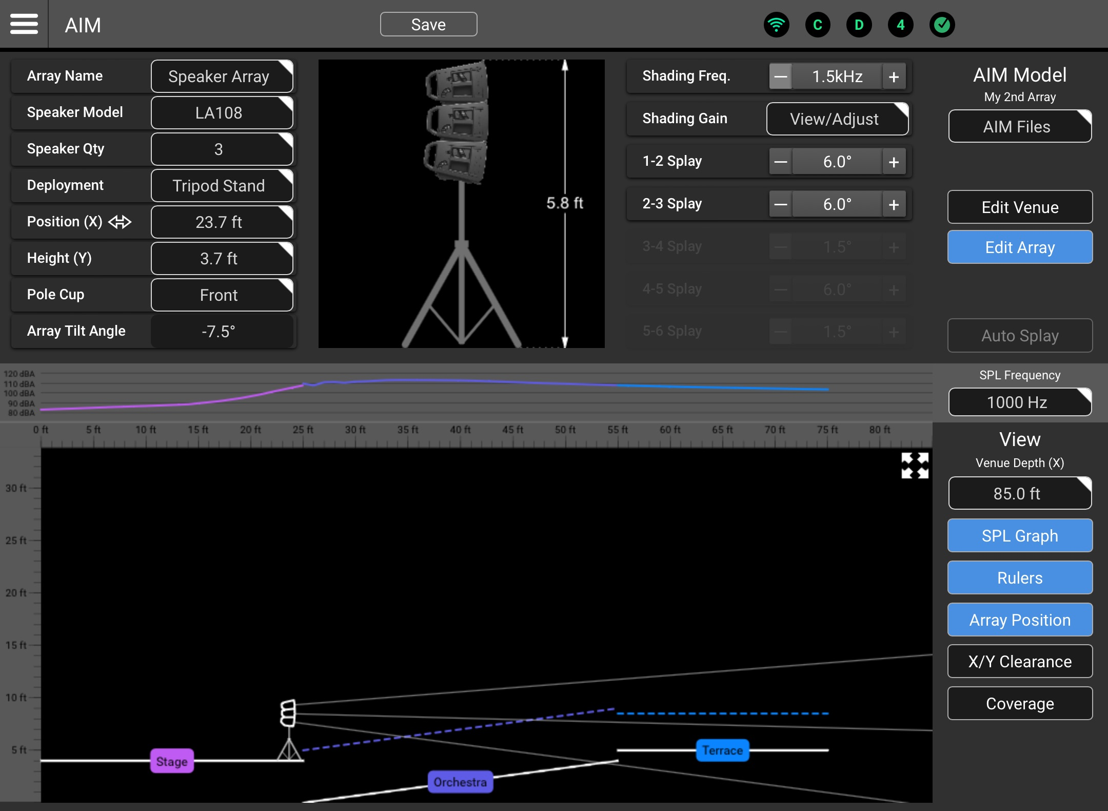 The Auto Splay feature provides a recommendation for array tilt and splay angles based on the selected array and the audience areas that have been defined in the model.