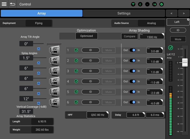 An array is Optimized when the DSP settings of the array members all match and the appropriate filters have been applied based on information provided by QSC AWARE™ regarding the number of array member loudspeakers and total splay. Also see Ar-Q. – See the “Arrays and Loudspeakers” section of List View for an explanation of optimization.-