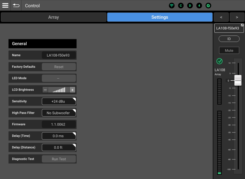LCD Brightness – Controls the brightness of the rear panel LCD on all array member loudspeakers.